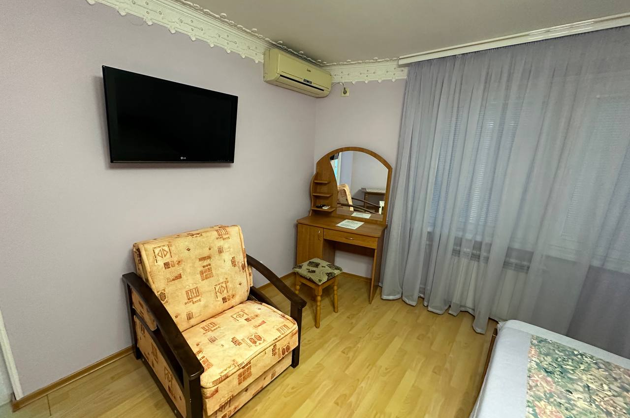 Номер выполнен в светло-розоватых тонах, где создается атмосфера уюта и комфорта. С балкона открывается чудесный вид на Черное море. Номер оборудован всеми необходимыми для вас удобствами. Гостевой дом «Климентина» рад предоставить вам хороший отдых в Мисхор.