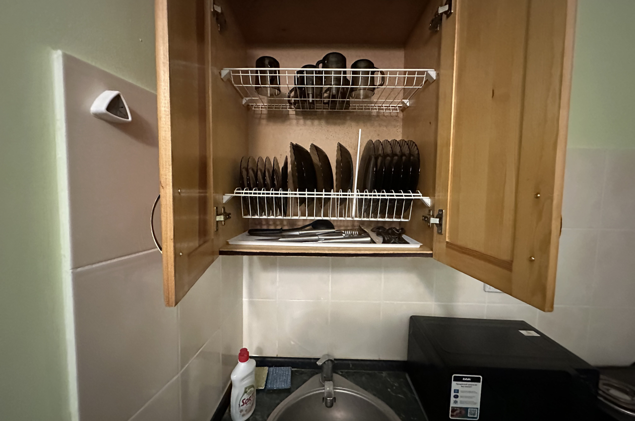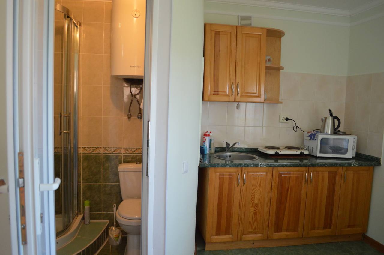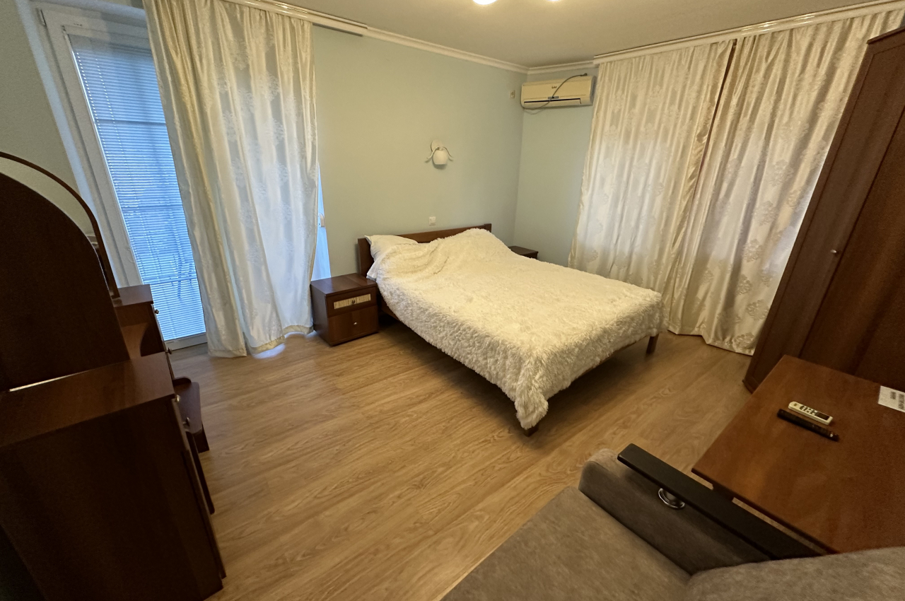 Номер оснащен санузлом ,двуспальной кроватью и небольшой кухней. В номере присутствует шкаф, стол, холодильник, кондиционер и телевизор. Детская кроватка.