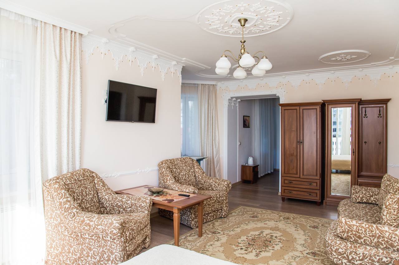 В номере присутствуют 2 комнаты : основная и детская. Основная комната оснащена шкафом, двуспальной кроватью и раскладным небольшим диваном. Детская комната оснащена одноместной кроватью и тумбой. Номер оборудован стандартным санузлом, холодильником и телевизором.